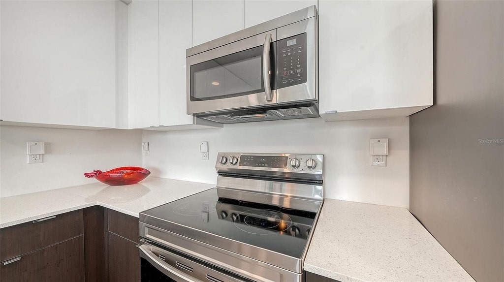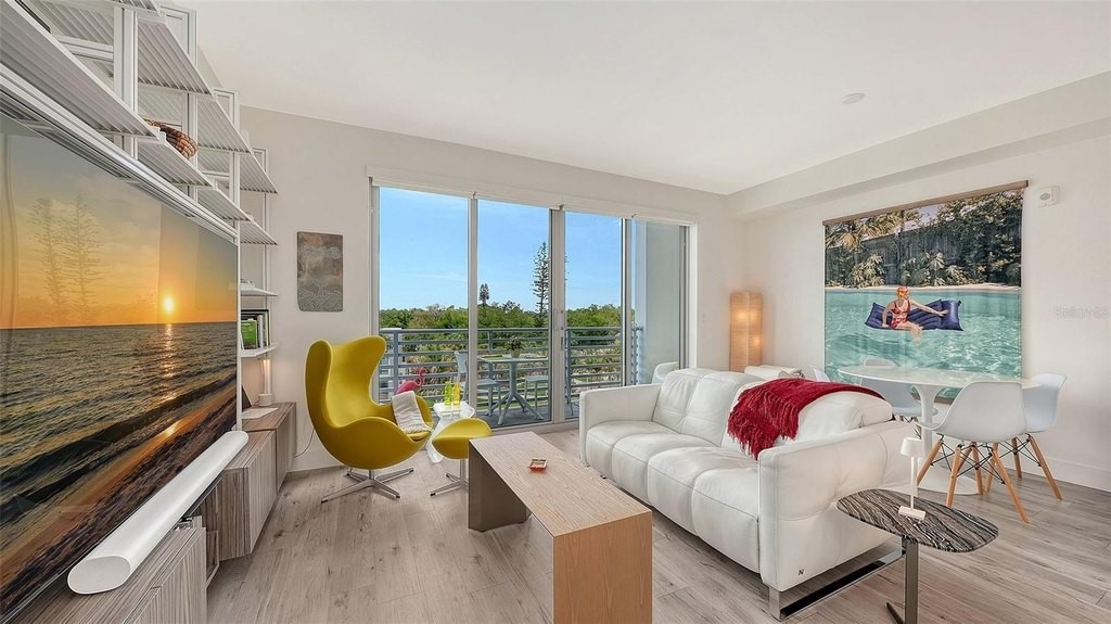 Discover an exceptional waterfront penthouse at The Strand offering unobstructed, pristine views from Whitaker Bayou to Sarasota Bay right from your generously sized balcony. Built in 2022 and lightly used by the original owners, this immaculate, never-rented residence features impact-rated windows, sliders and doors, 9-foot ceilings, and thoughtful high-end upgrades throughout. The living area showcases a custom white wall unit with multiple shelving and a perfectly fitted 75" TV. The primary suite includes a walk-in closet with custom California Closet built-ins, while both the main bedroom and living room are equipped with motorized shades for effortless light control. The kitchen and both bathrooms feature custom installed stainless steel pullout cabinet organizers to maximize convenient storage. A versatile den with barn doors and a closet can function as an office or even a second bedroom. Modern conveniences include a smart A/C thermostat and programmable front-door lock, a programmable (from your phone) entry LED smart light fixture capable of altering brightness and displaying a rainbow of colors, wall light dimmers installed in kitchen, hallway and guest bath, front-loading full-size Samsung washer and dryer, garage parking beneath the building, and a private storage cage in an enclosed storage room. Enjoy resort-style amenities: heated pool and spa, fitness center, gas fire pit and grills, EV charging stations, dog park, and kayak launch with storage. Located mere minutes from vibrant downtown Sarasota - with fine dining, galleries, shopping, theater, bay front parks and The Bay community activities - this penthouse delivers refined waterfront living and easy access to coastal recreation.